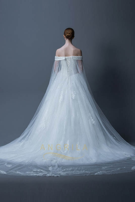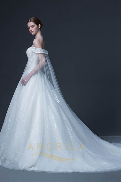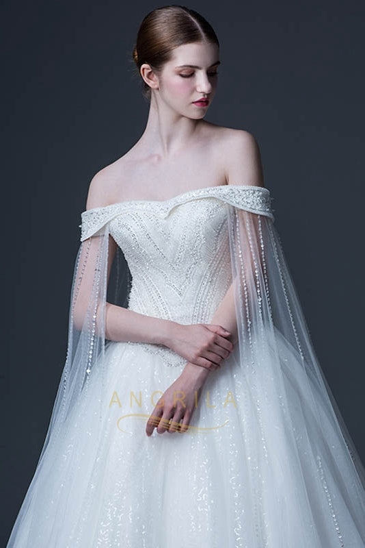 Silhouette: Princess, A-LineHemline / Train: Sweep / Brush TrainNeckline: Off ShoulderFabric: Tulle, LaceClosure: Zipper UPSleeve Length: Long SleeveWaistline: NaturalFully Lined: YesEmbellishment: AppliquesBuilt-In Bra: YesBoning: YesWedding Venues: ChurchTips: Professional dry cleaner only, Colors may vary slightly due to different monitor settingsTheme: Luxurious, RomanticWrap: No