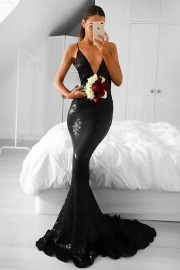 Glamorous Black Sequins Mermaid Evening Dress Spaghetti-Straps V-Neck