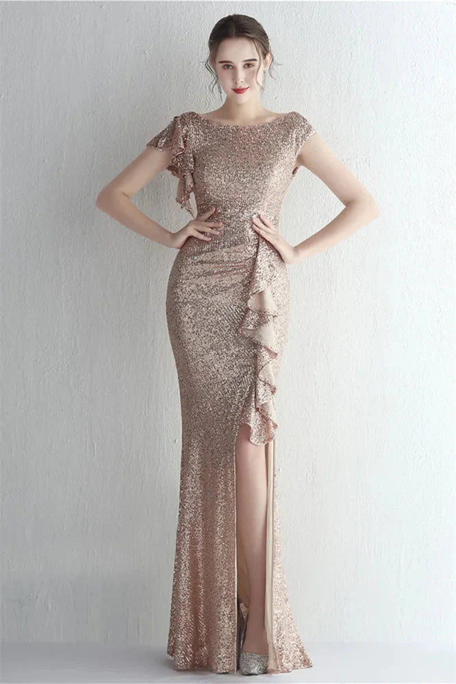 Glamorous Cap Sleeveless Mermaid Sequins Evening Gown Long With Split Ruffles