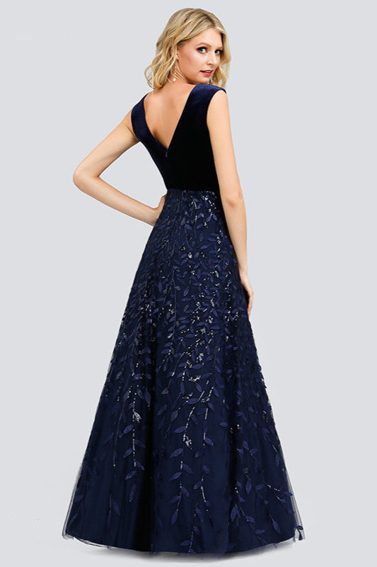 Glamorous Navy V-Neck Evening Dress with Leaves Appliques
