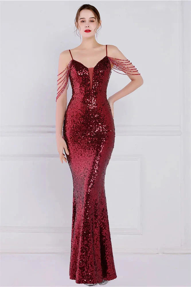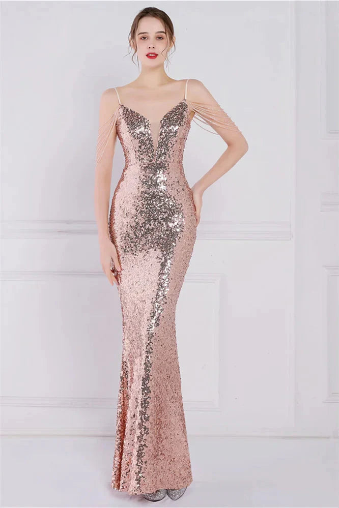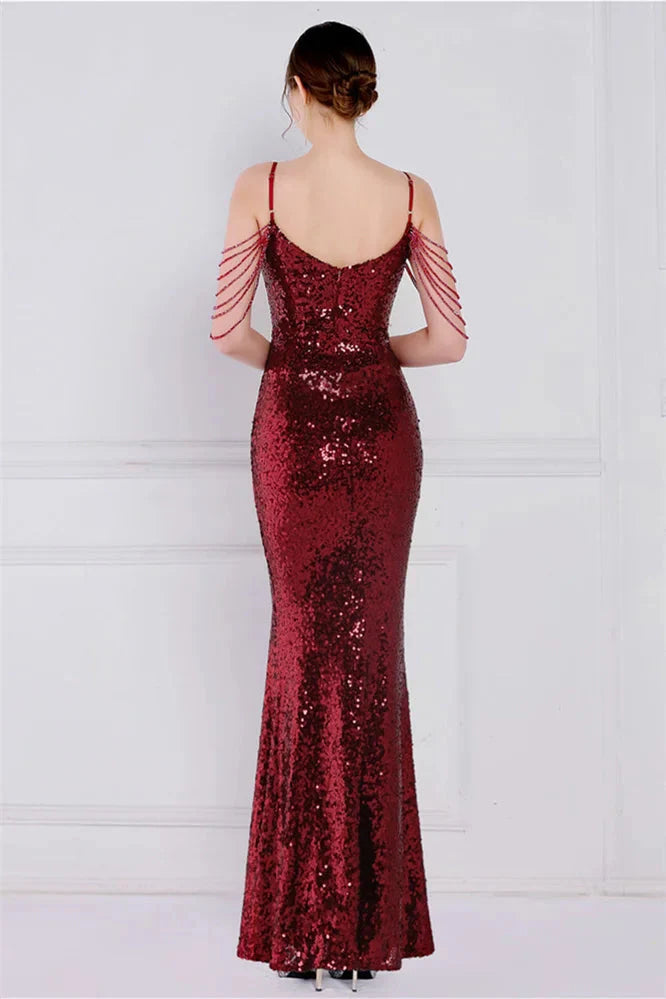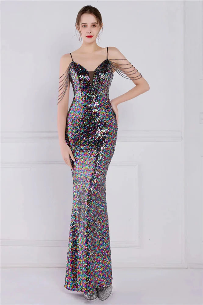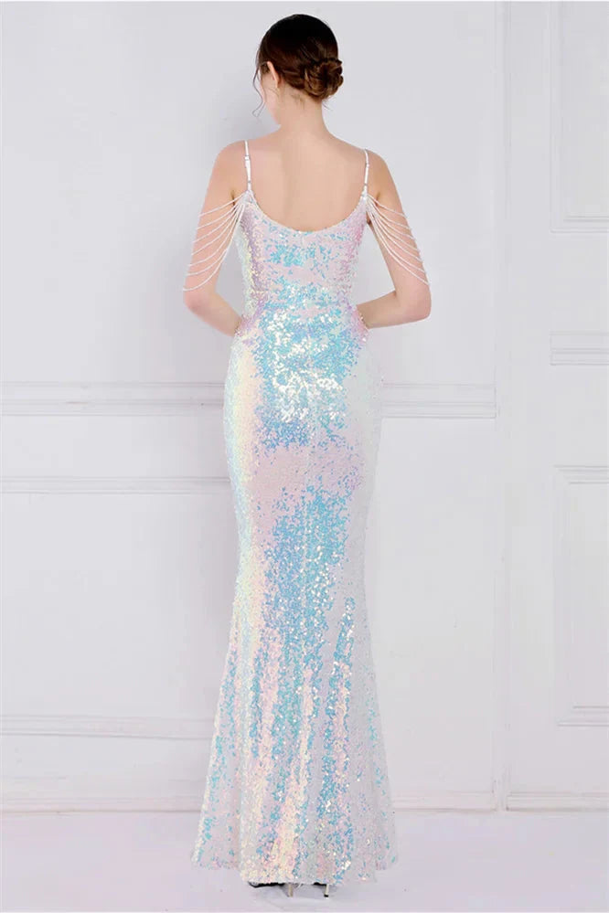 Glamorous Spaghetti-Straps Sequins Evening Gown Mermaid Sleeveless