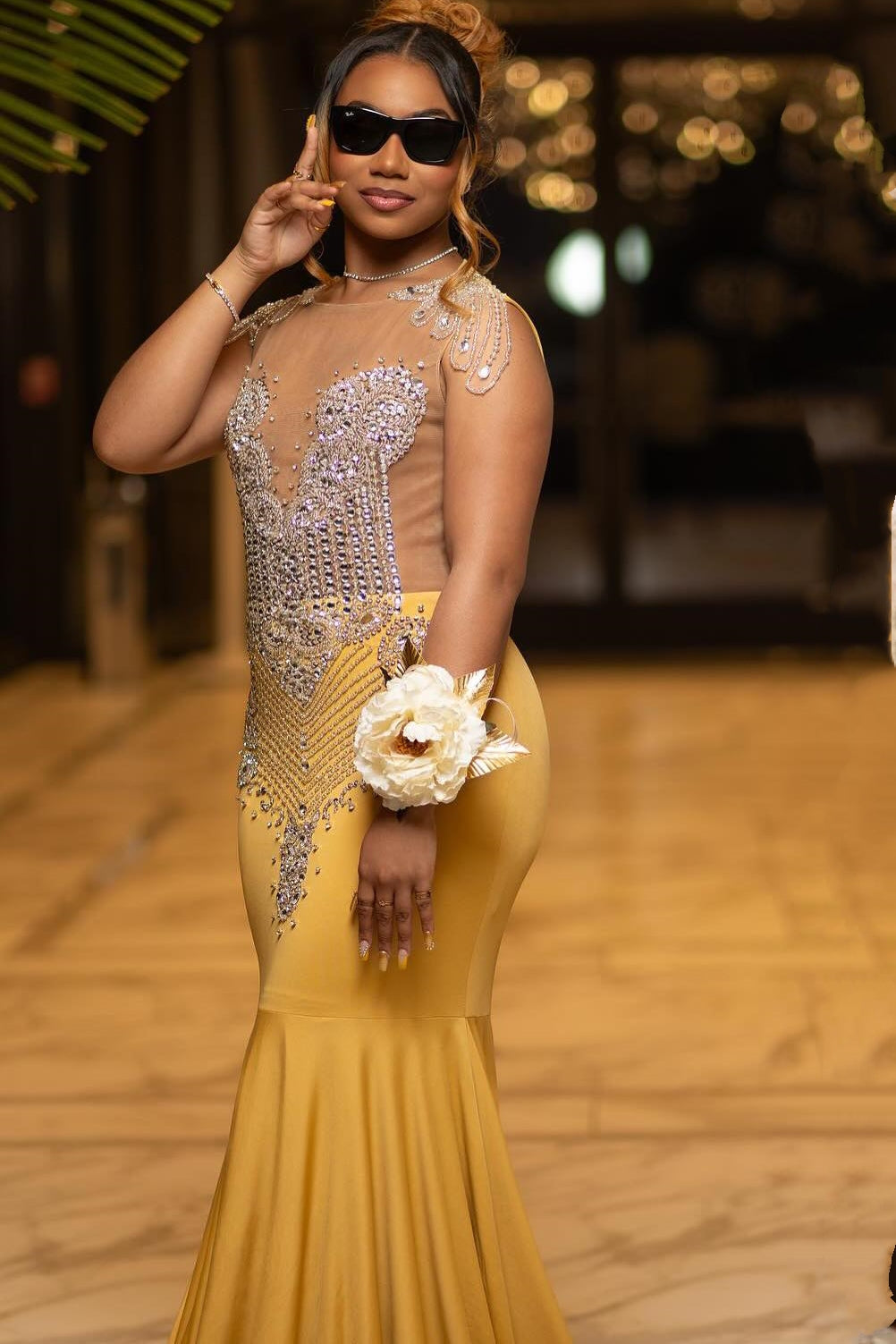 Stand out in this Glamorous Yellow Mermaid Cap Sleeve Crystal Prom Dress. The special crystal design adds a touch of elegance, while the soft satin material and sweep train hemline make you look and feel like a queen. With a jewel neckline and cap sleeves, this dress exudes a sexy and lively style. Perfect for any special occasion.