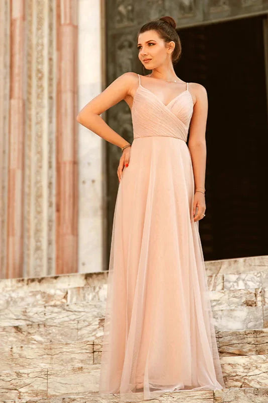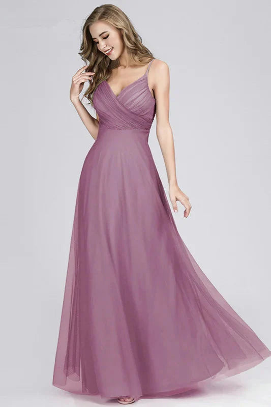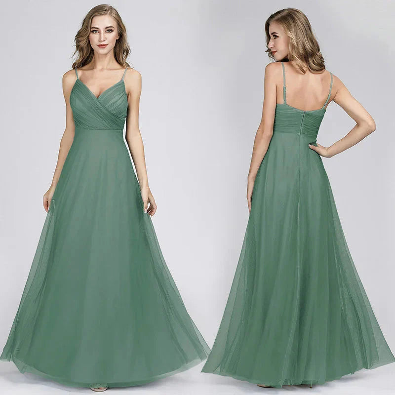 Gorgeous Dusty Blue V-Neck Prom Dress Long Tulle Evening Party Gowns