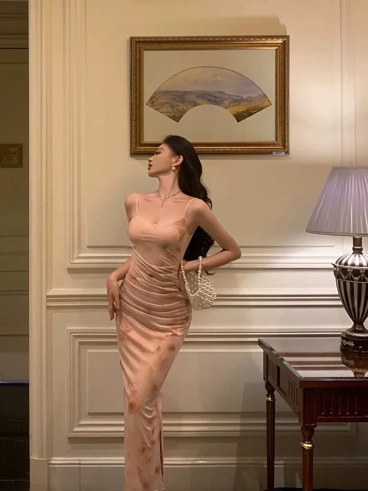 Gorgeous Mermaid Spaghetti Straps Pink Floral Date Night Dress Prom Dresses Birthday Outfits SD1093