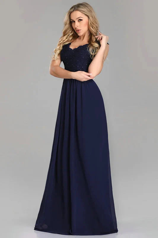 Gorgeous Navy Blue Lace Prom Dress Long V-Neck Beadings Evening Gowns
