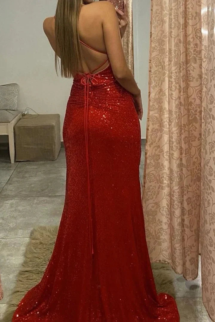 Gorgeous Red Spaghetti-Straps Sequins Mermaid Evening Dress V-Neck With Split