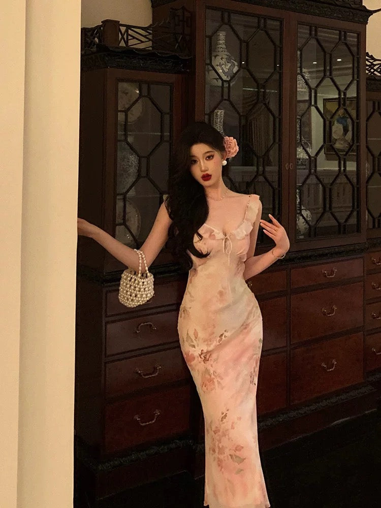 Gorgeous Sheath V Neckline Date Night Dress Floral Pink Prom Dresses Party Dress Birthday Outfits SD788