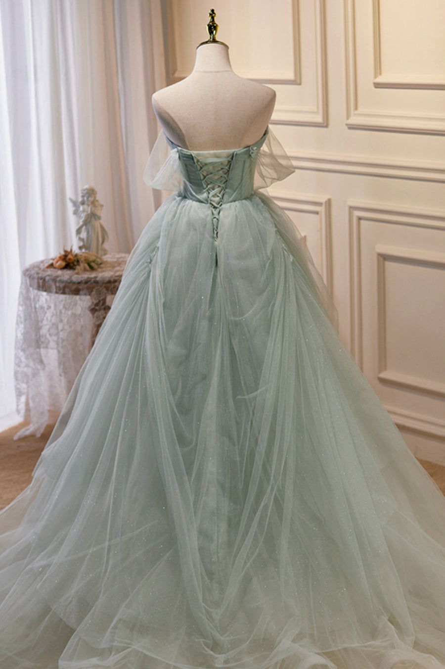 Green Tulle Beaded Ball Gown Off Shoulder Party Dress, Green Sweet 16 Dress