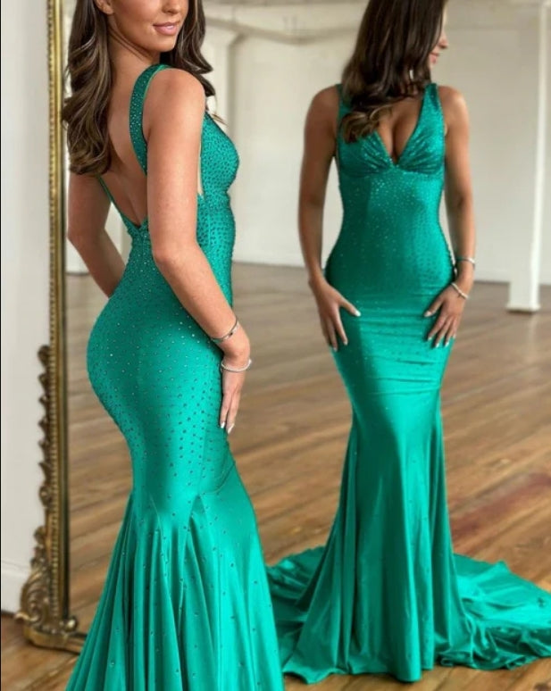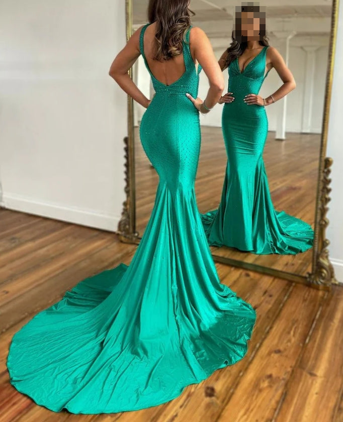 Aimishang Green V Neck Backless Beads Mermaid Long Prom Dress Sexy Evening Dress