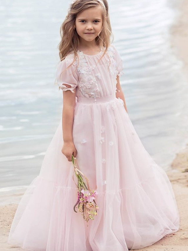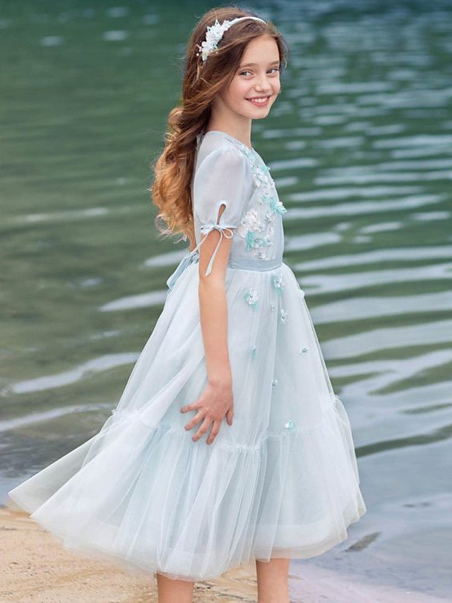 Half Sleeve A-Line Flower Girl Dress with Tulle and Appliques