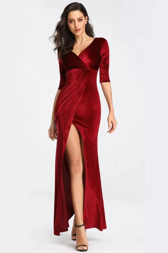 Occasion: Wedding Guest, Formal EveningStyle: Minimalist, VintageSilhouette: Sheath / ColumnHemline / Train: Floor LengthNeckline: V NeckFabric: VelvetClosure: Zipper UPSleeve Length: Long SleeveEmbellishment: Split, DrapingBuilt-In Bra: YesBoning: YesTips: Colors may vary slightly due to different monitor settings, Hand Wash Only
