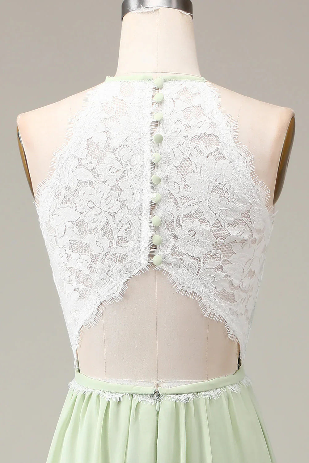 Dusty Sage Halter Neck Lace And Chiffon A-Line Floor Length Bridesmaid Dress