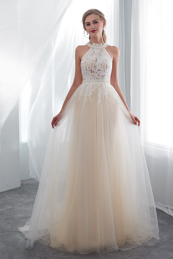 Halter Sleeveless Tulle Bridal Dresses with Lace Appliques