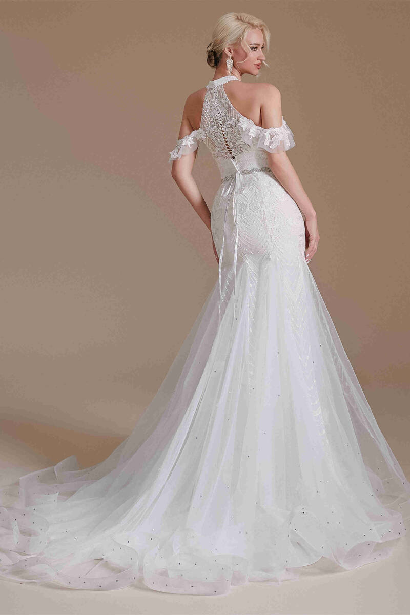 Fancyvestido this long weddding dress features with halter neckline, detachable sleeves and beaded belt.