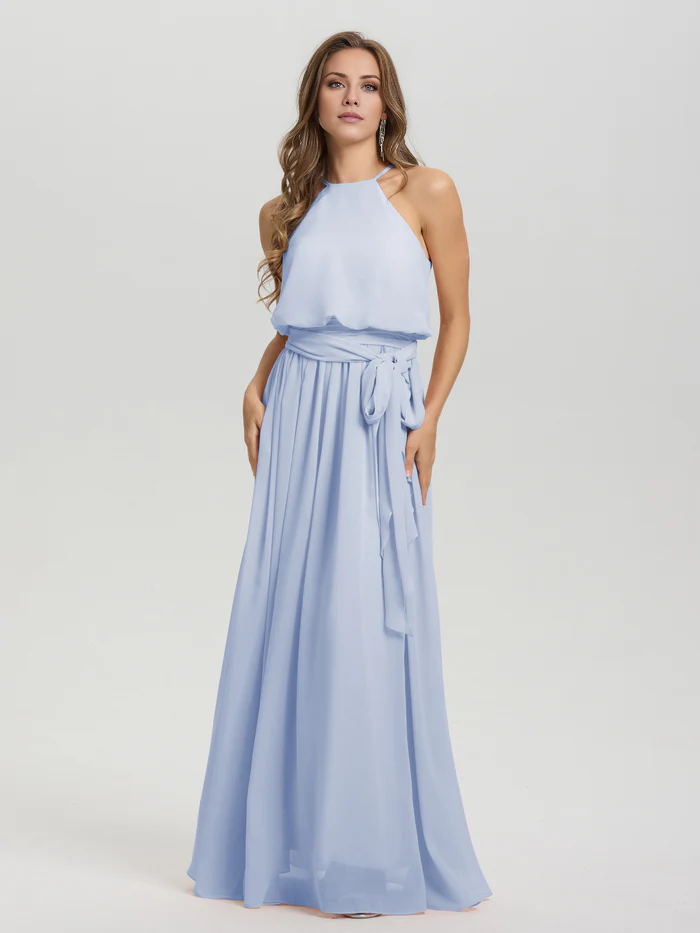 Hanging neck low round neck sleeveless chiffon and floor length Bridesmaid dresses