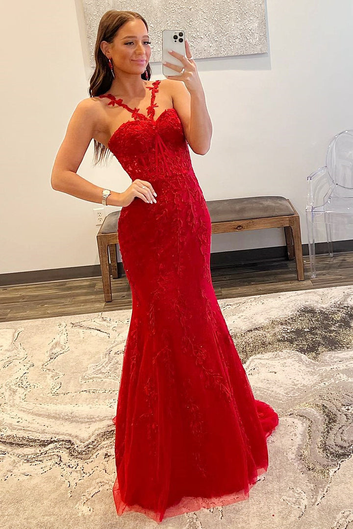 Hot Mermaid Halter Lace Prom Dresses With Appliques