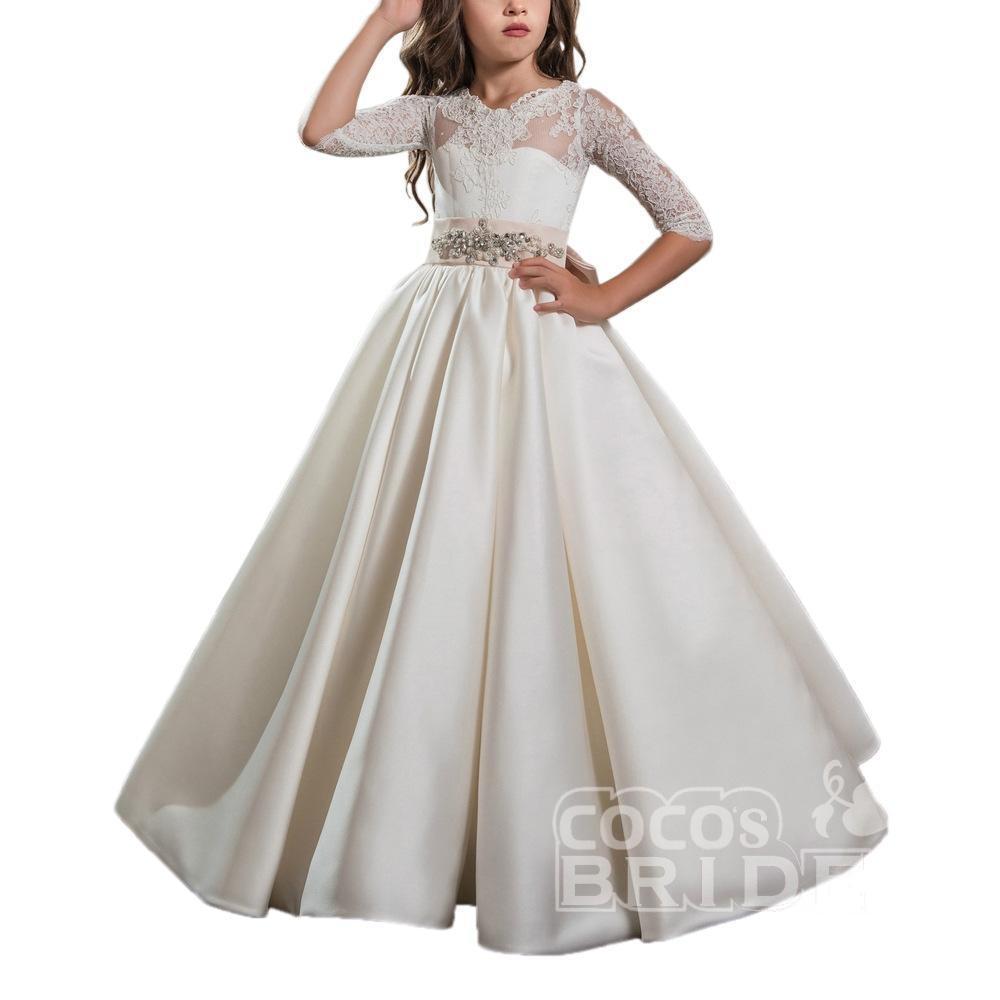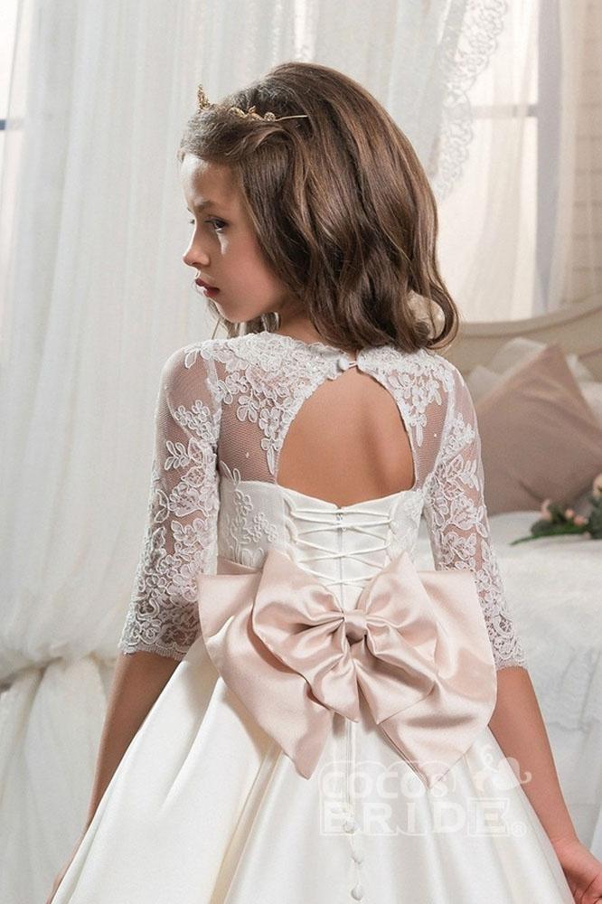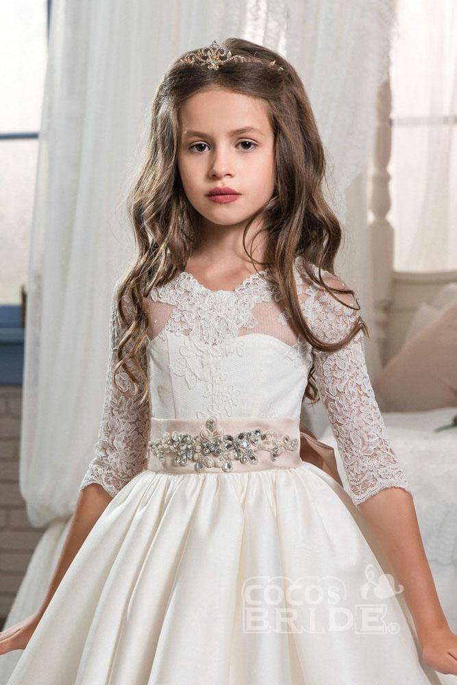 Ivory Long Sleeves Ball Gown Chiffon Lace Flower Girls Dress