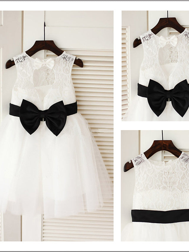 Jewel Sleeveless A-Line Tea Length Flower Girl Dress with Tulle and Lace Satin Belt