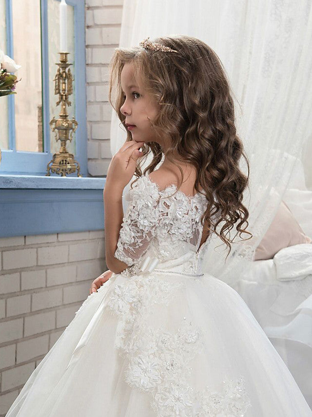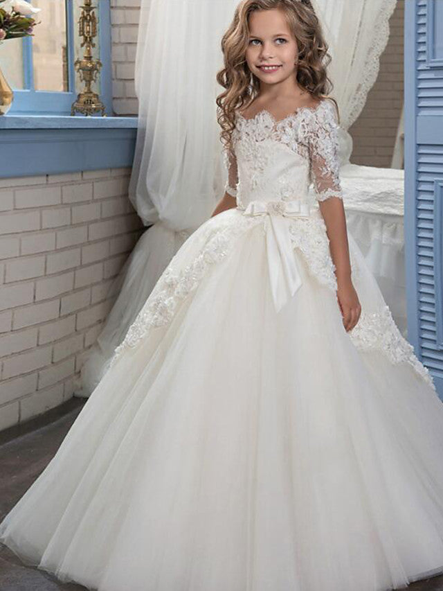 Lace Half Sleeve Ball Gown Flower Girl Dresses with Tulle Appliques and Buttons