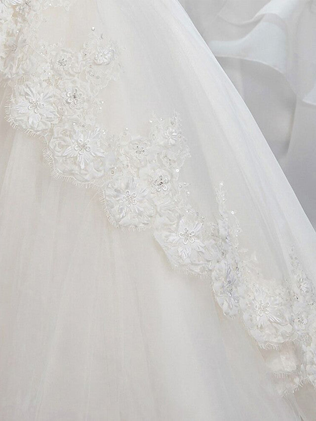 Princess A-Line Wedding Dresses Off Shoulder Sweep / Brush Train Lace Tulle Long Sleeve Romantic Luxurious with Appliques - Ivory