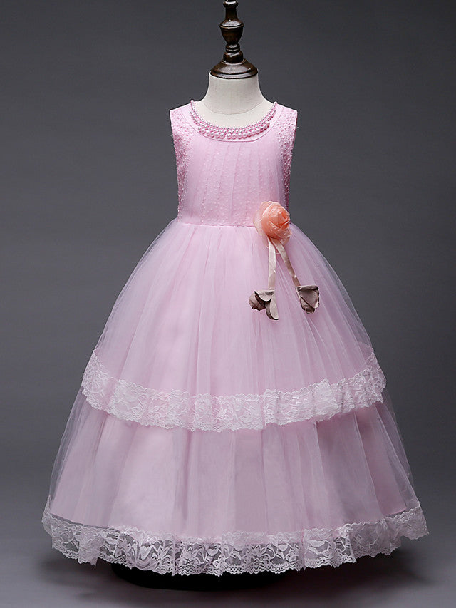 Lace Tulle Polyester Sleeveless Jewel Floor Length Flower Girl Dress With Pearls and Appliques