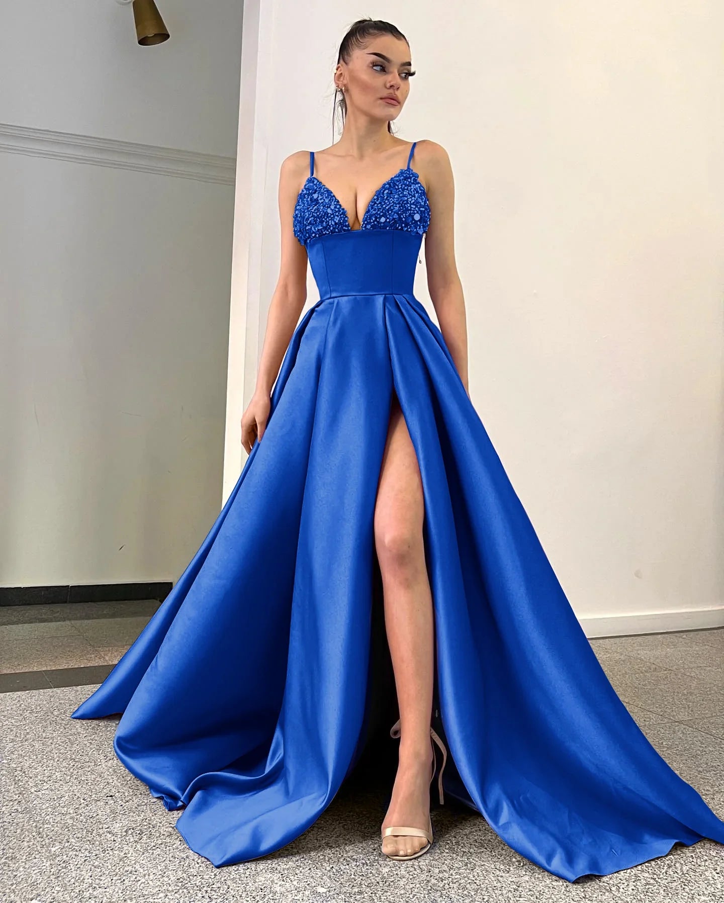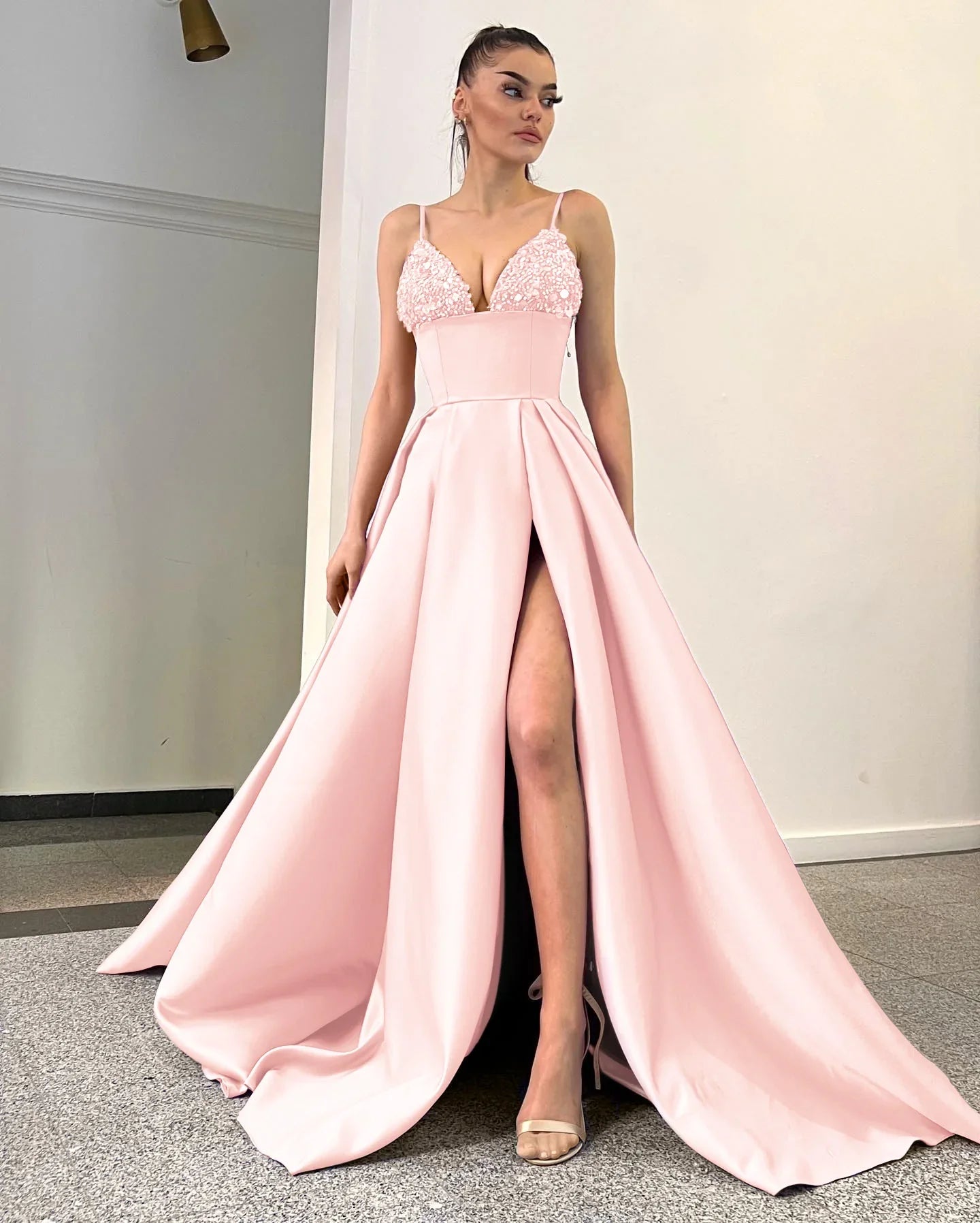 Lavender Spaghetti Straps Sequins A Line Evening Dress With Split Sexy Party Dress