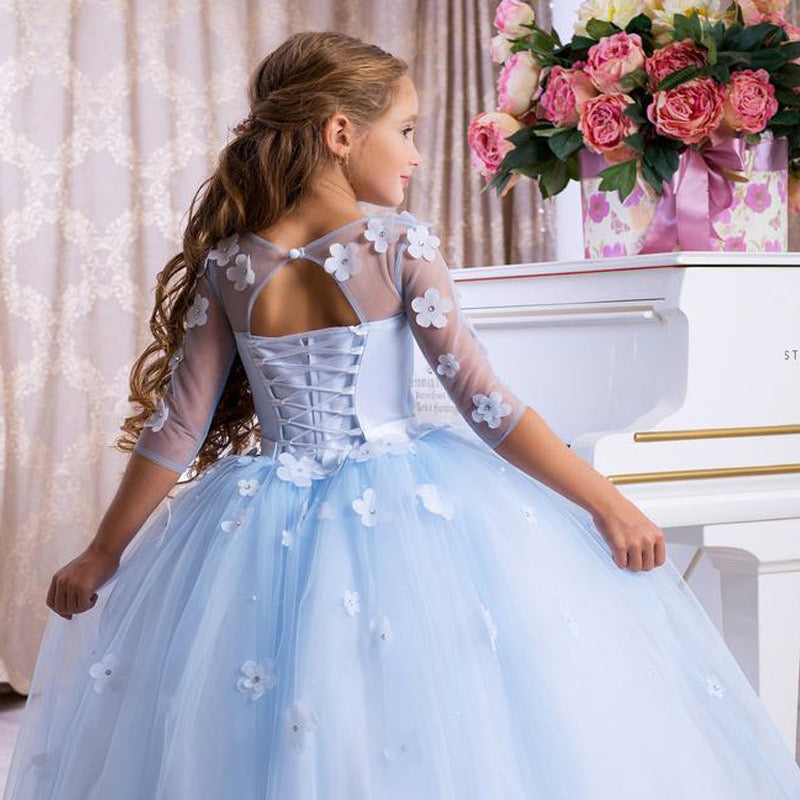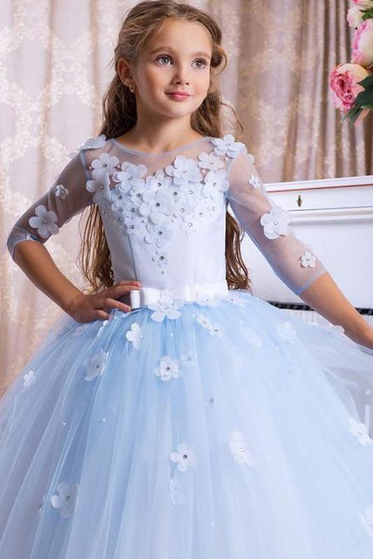 Light Blue Ball Gown Flower Girls Dress with Scoop Neck 3/4 Sleeves