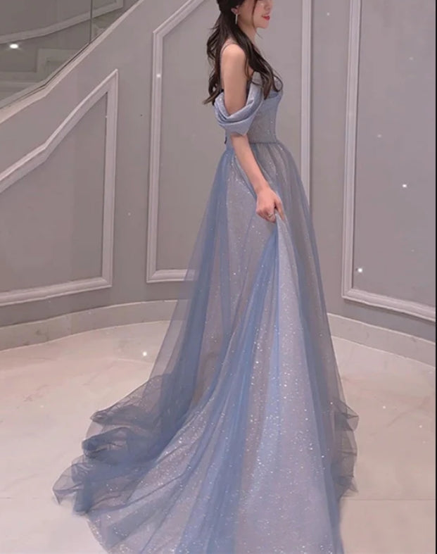Light Blue Sweetheart Off Shoulder A-line Long Prom Dress Beaded Evening Dress