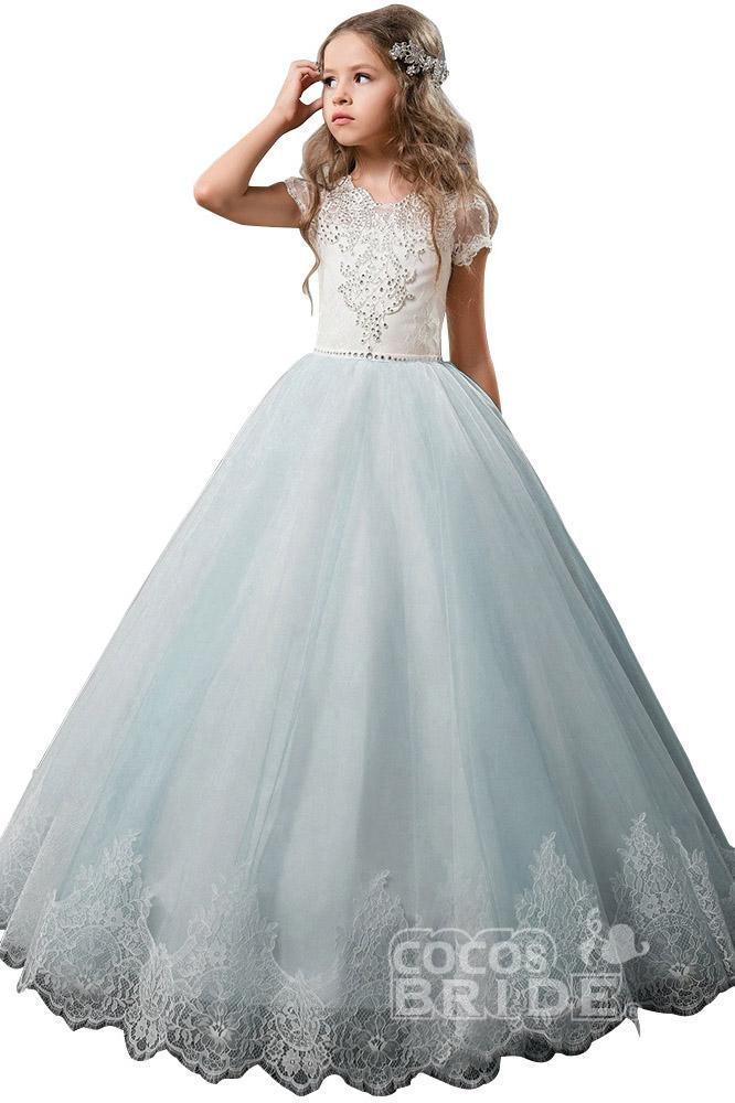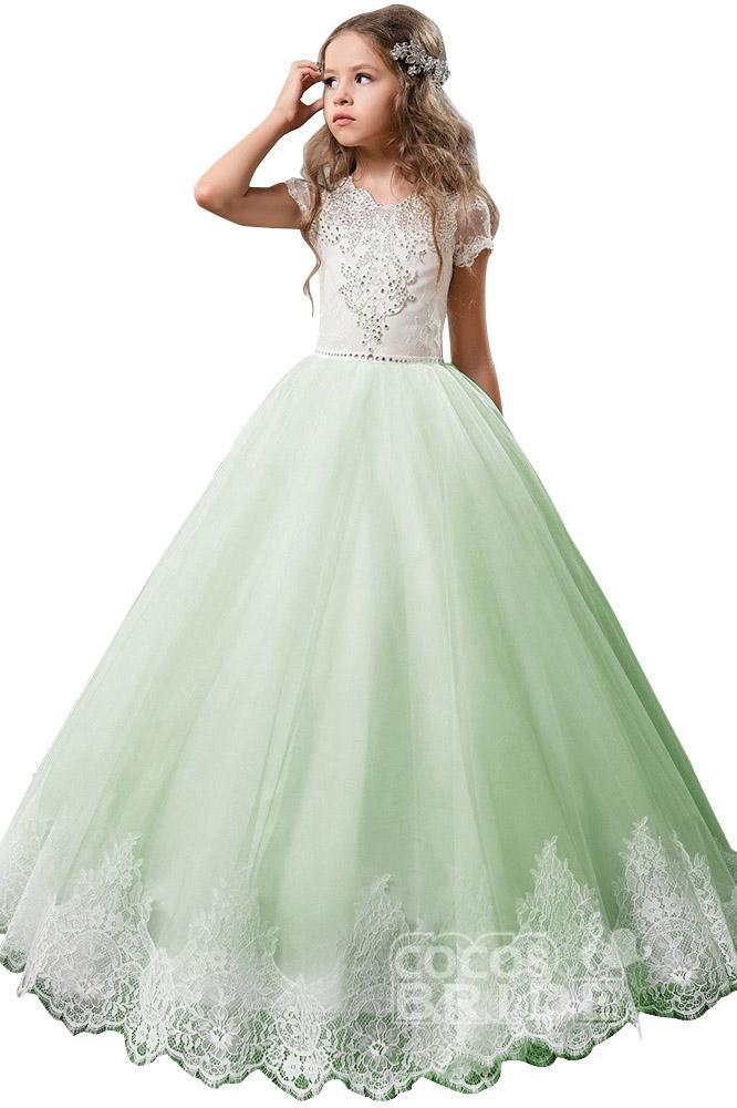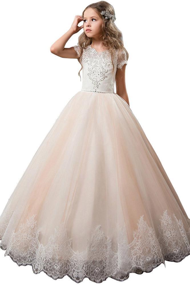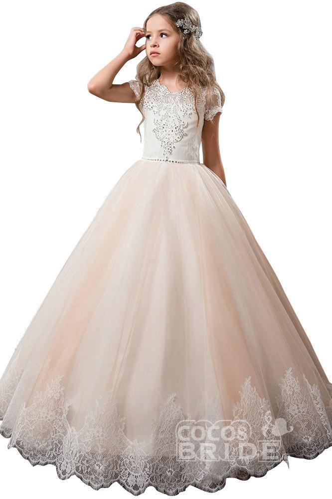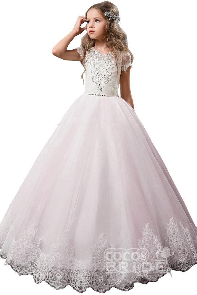 Light Pink Short Sleeve Scoop Neck Ball Gown Flower Girls Dress