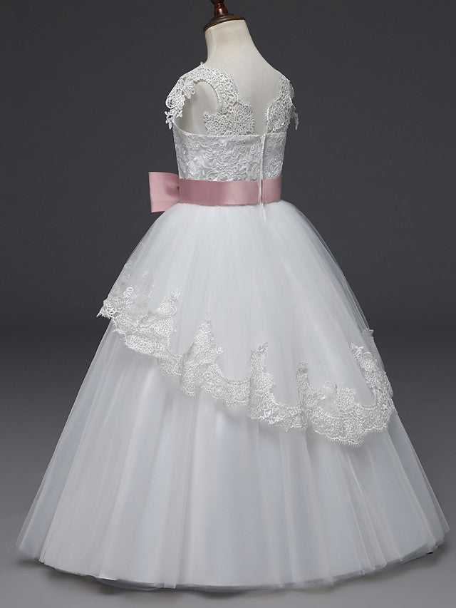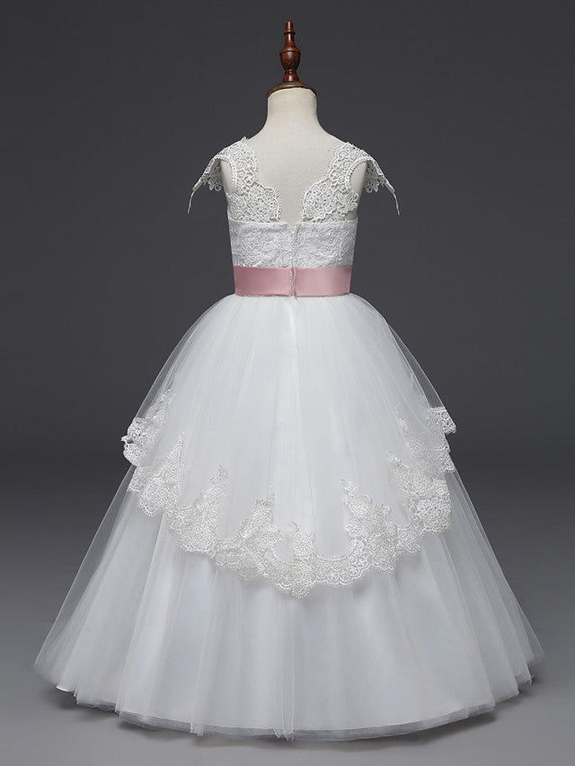 Long Length Cap Sleeve Scoop Neck Flower Girl Dresses with Lace Tulle Belt and Appliques