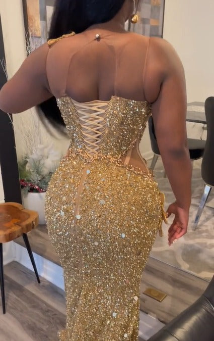 Dazzle in this breathtaking Long Mermaid Sequin Gold Prom Dress. The elegant sleeveless design features a stunning lace-up back and shimmering sequin detailing. With its flattering mermaid silhouette, this dress is perfect for any formal occasion. Elevate your style with this exquisite piece.