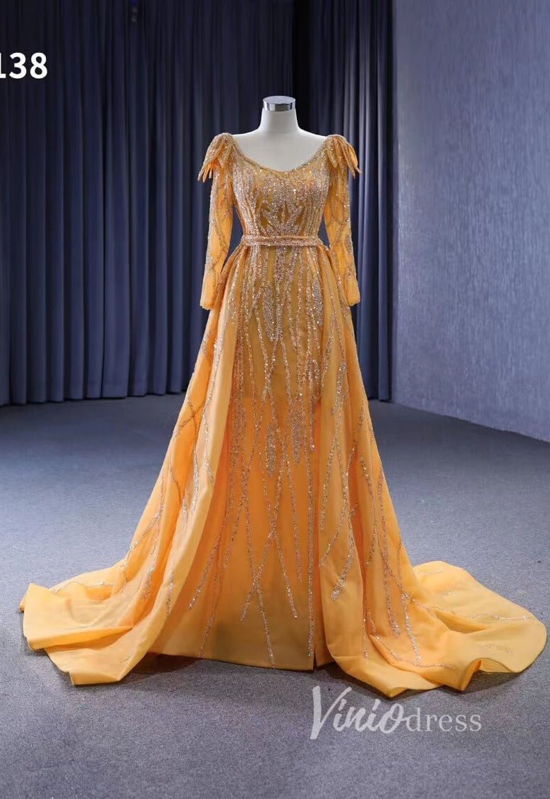 This elegant long-sleeved gold wedding dress is crafted from intricately beaded lace fabric and topped with a beautiful removable overskirt in 40cm long trail for a perfect pageant look. Accentuate your special day in style with this gorgeous and timeless ensemble.