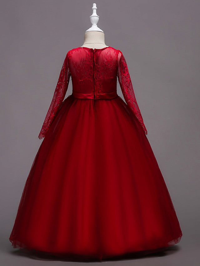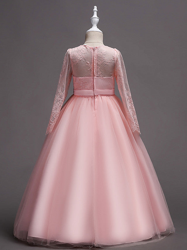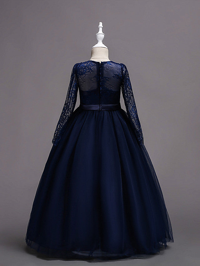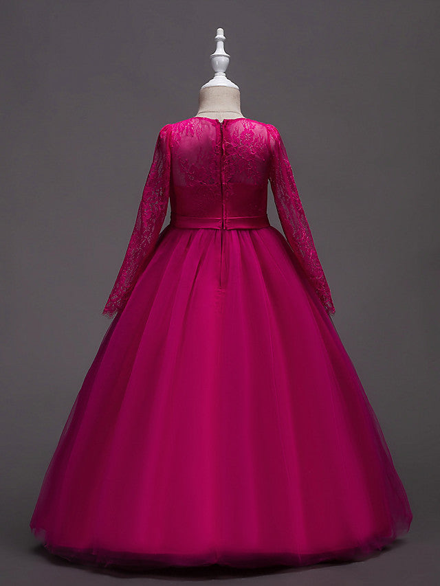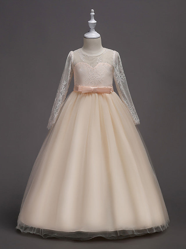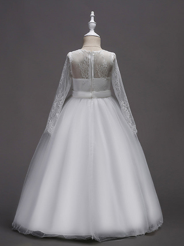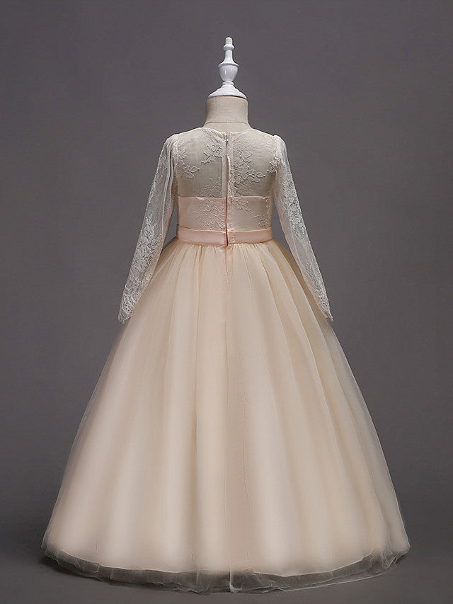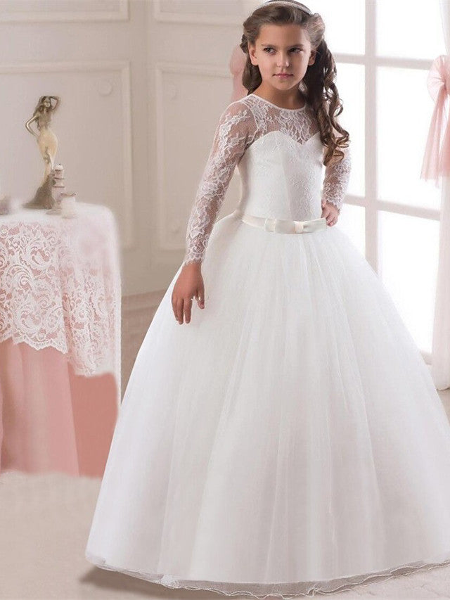 Long Sleeve Jewel Neck Lace Satin Tulle Flower Girl Dress with Lace Belt