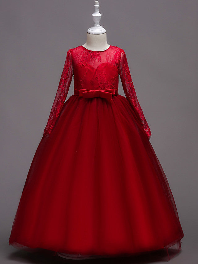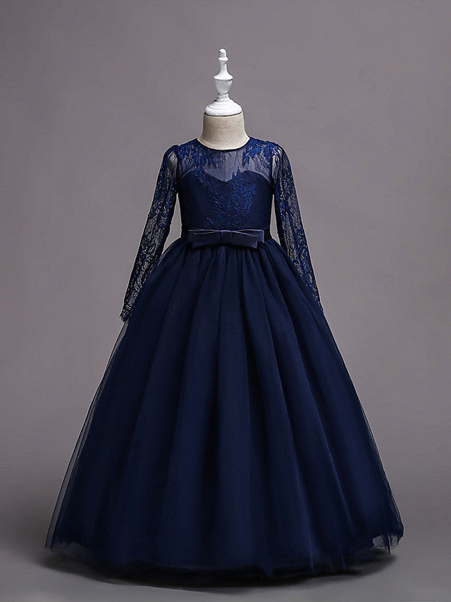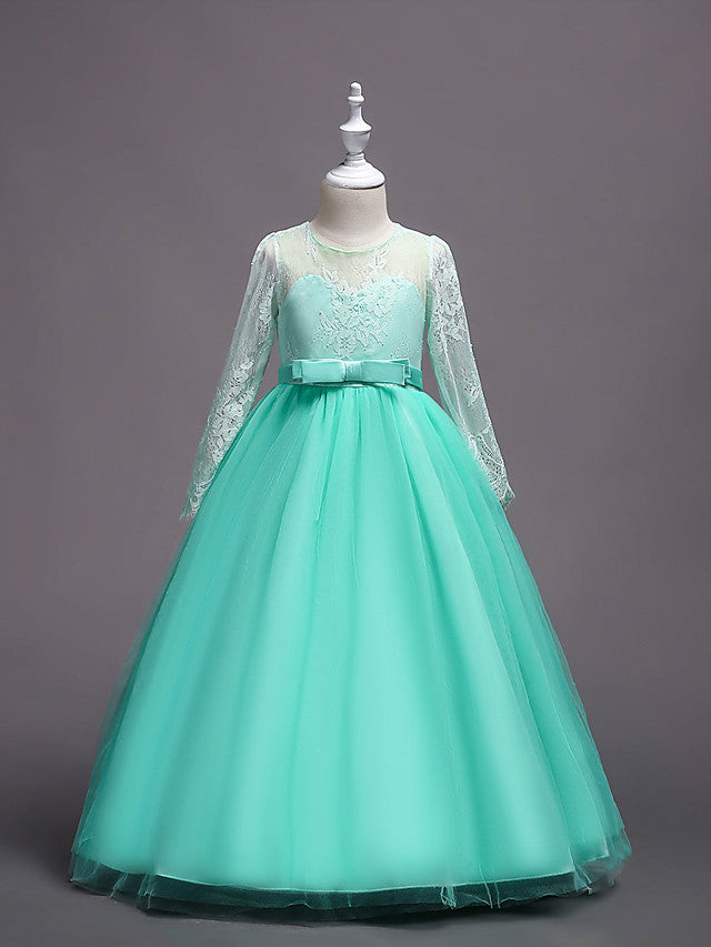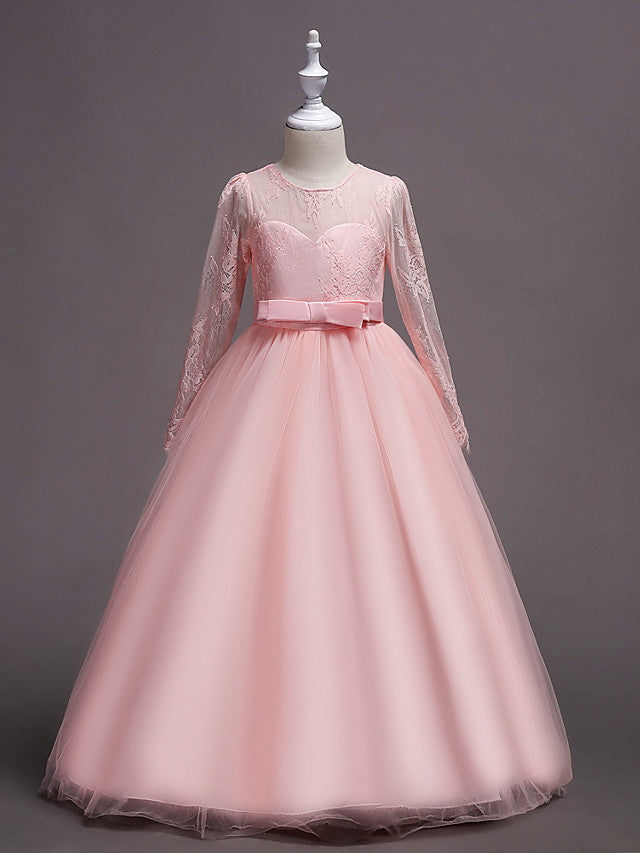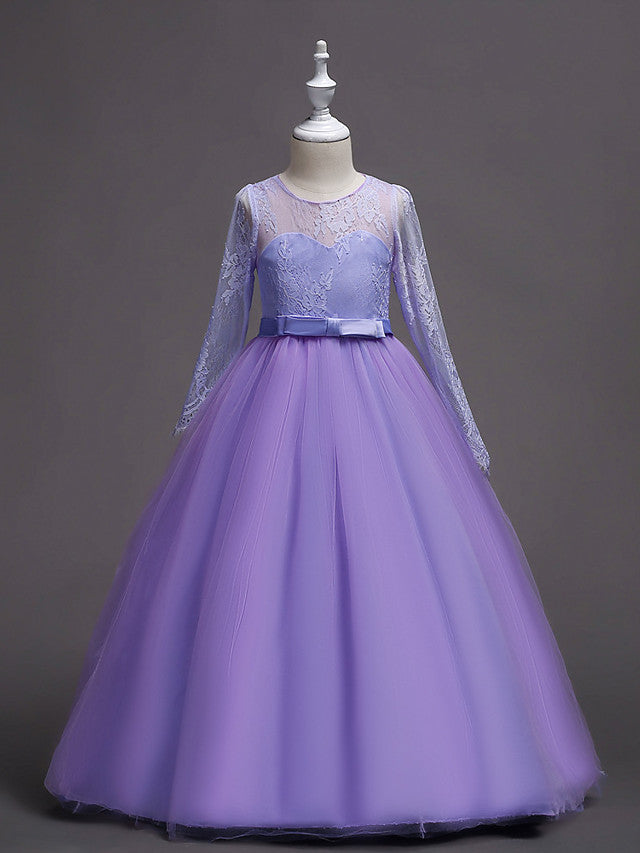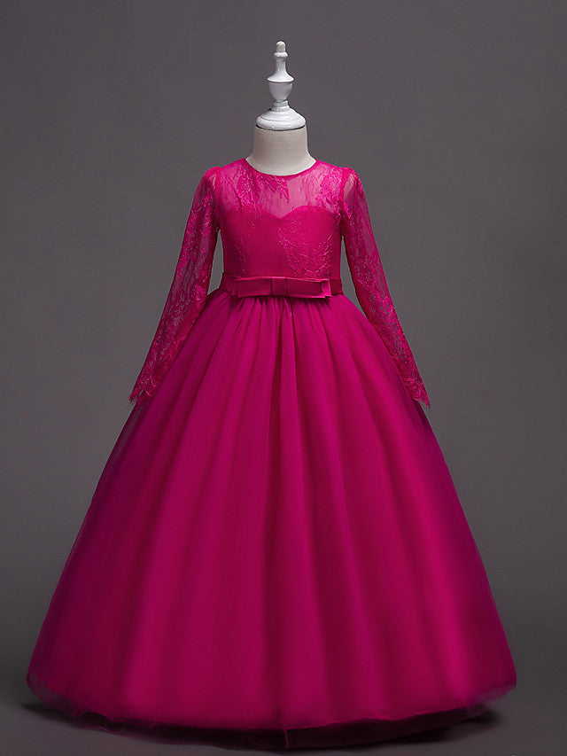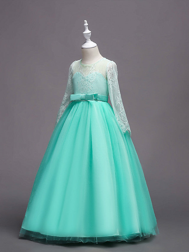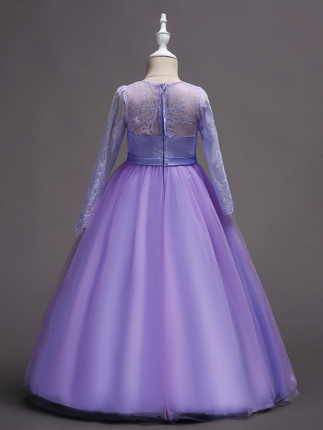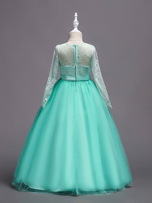 Long Sleeve Jewel Neck Lace Satin Tulle Flower Girl Dress with Lace Belt