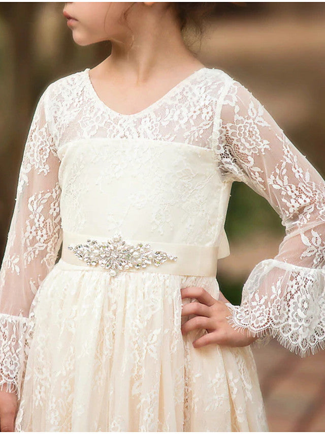Long Sleeve V-Neck Ball Gown Flower Girl Dress with Lace Bow Appliques