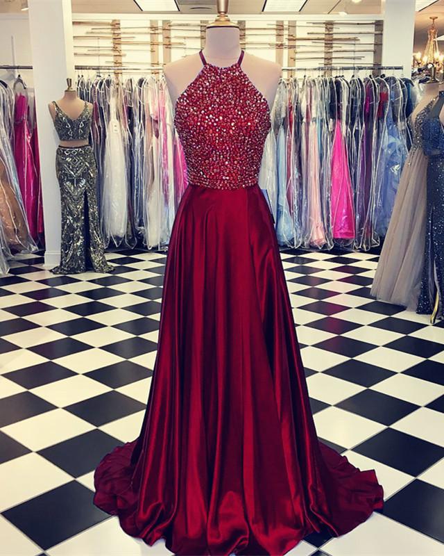 Item Description : A Glamorous Form Satin Floor Length Dress Featuring Crystal Beaded Halter With Leg Split And Open Back Design. Perfect For Prom,Evening,Formal Wedding,Bridesmaid en Or Any Other Special Occasions ! Colors Available: Burgundy,Royal Blue,Gold,Purple,Black,Navy Blue