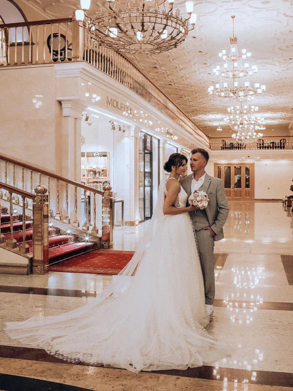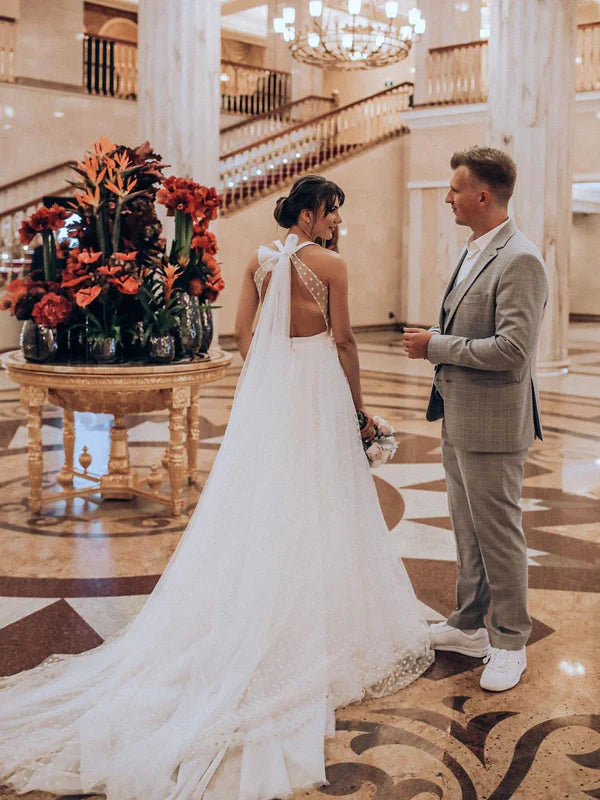 Marvelous V-neck A-line Polka Dot Lace Wedding Dresse Tulle Bridal Gowns