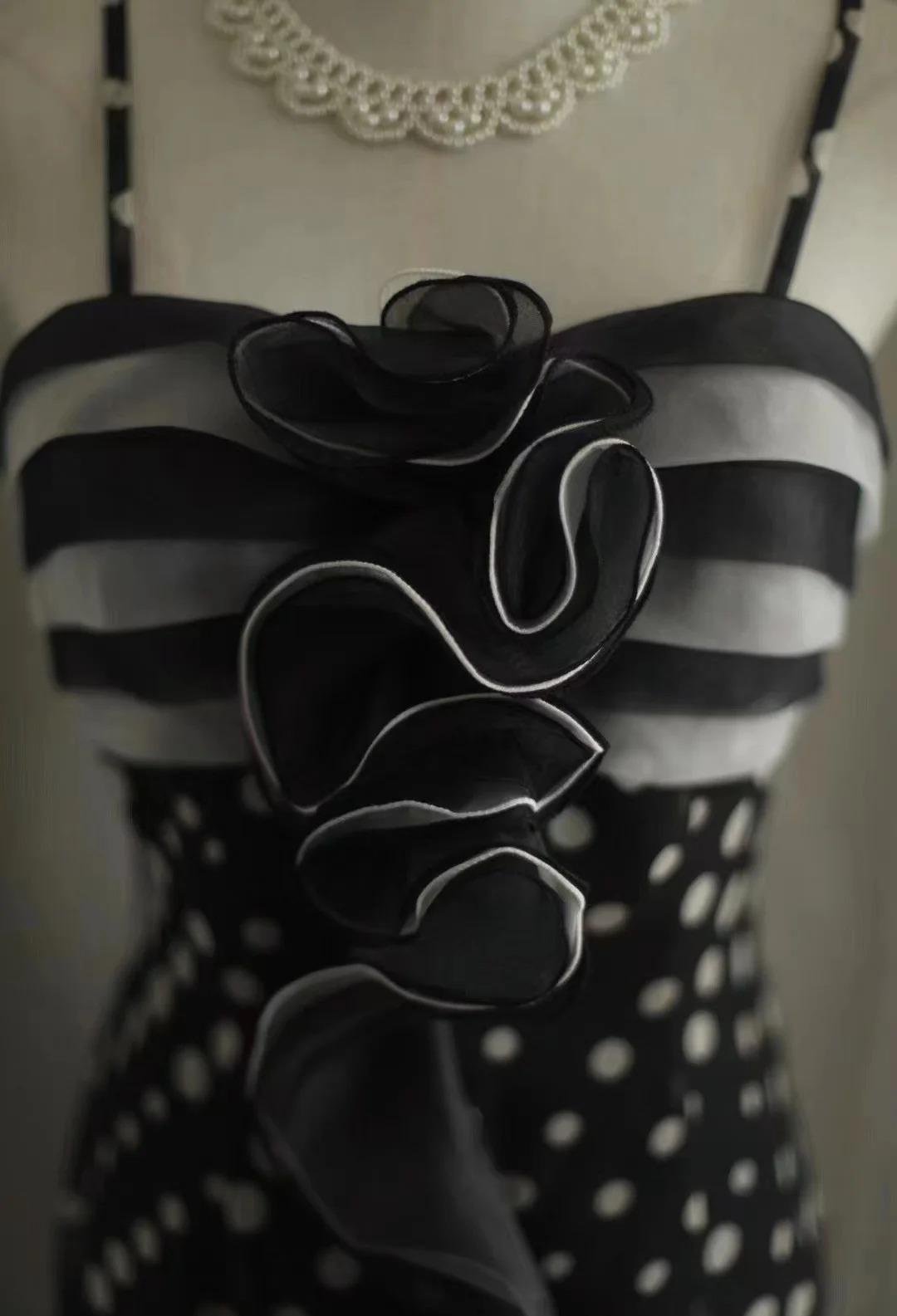 Mermaid Black Spaghetti Strap Chiffon Long Prom Skirt Polka Dot Evening Dress ED01731