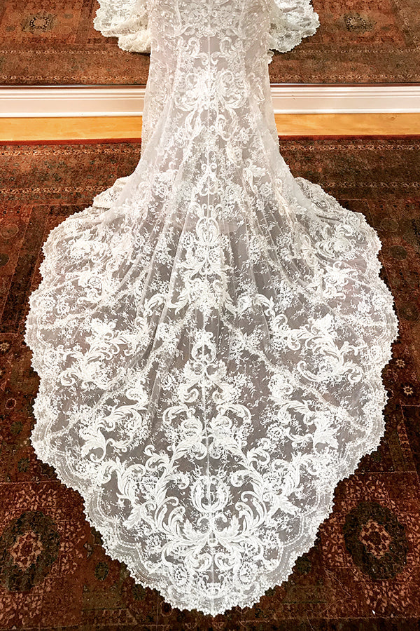 Mermaid long ivory wedding dress with deep v neck, sheer back and chapel train.