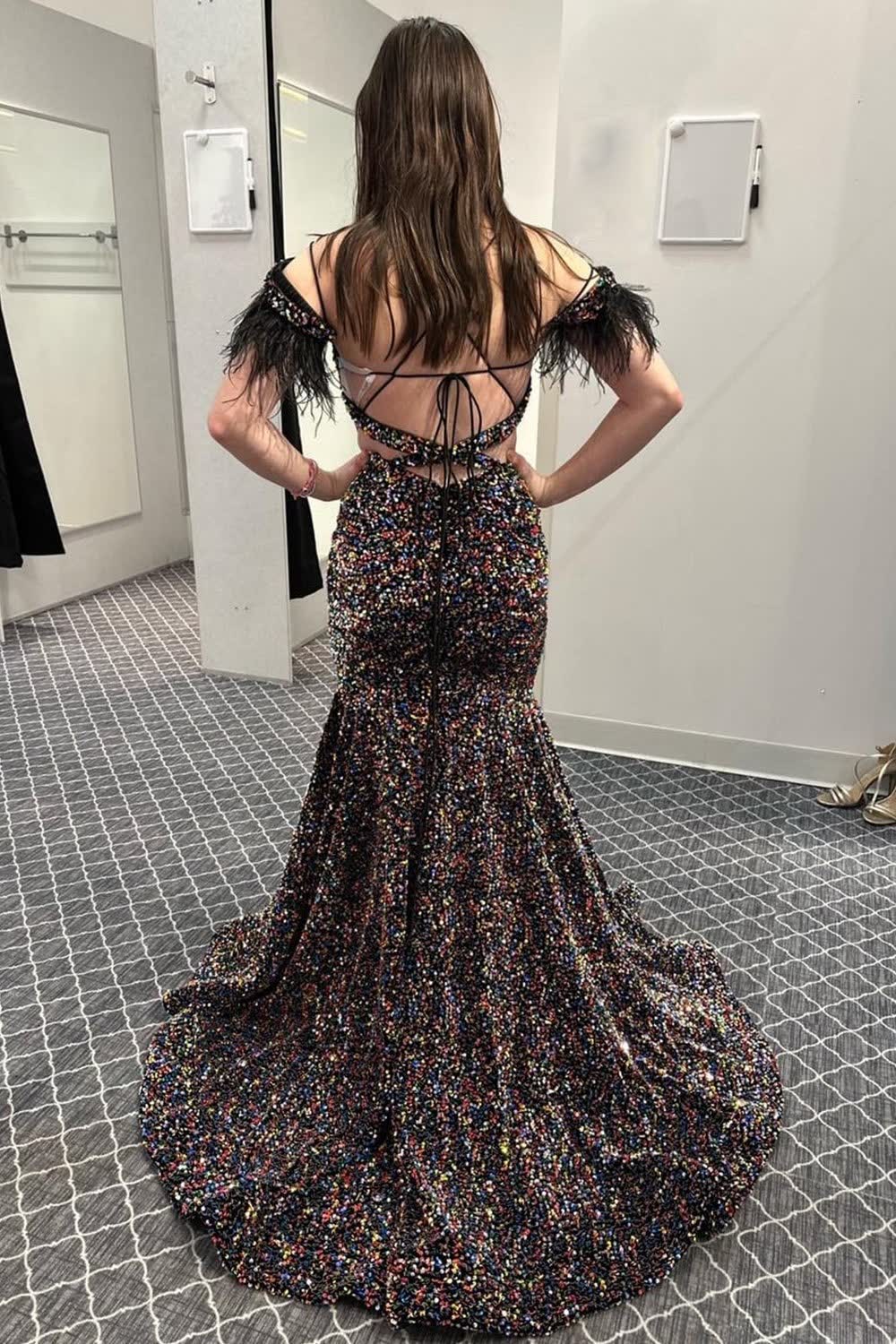 Mermaid Off the Shoulder Purple Sequins Cut Out Prom Dress with Feathers