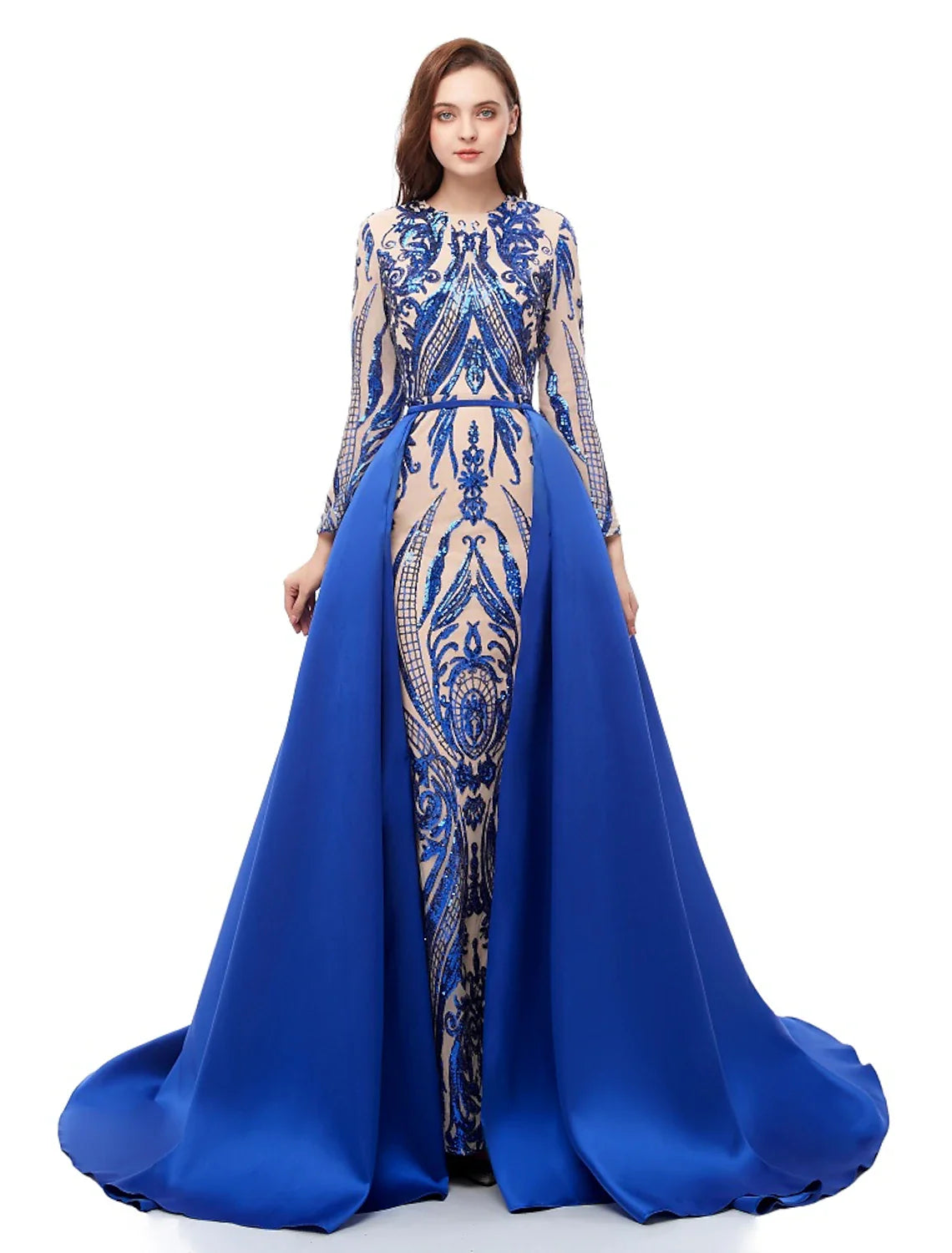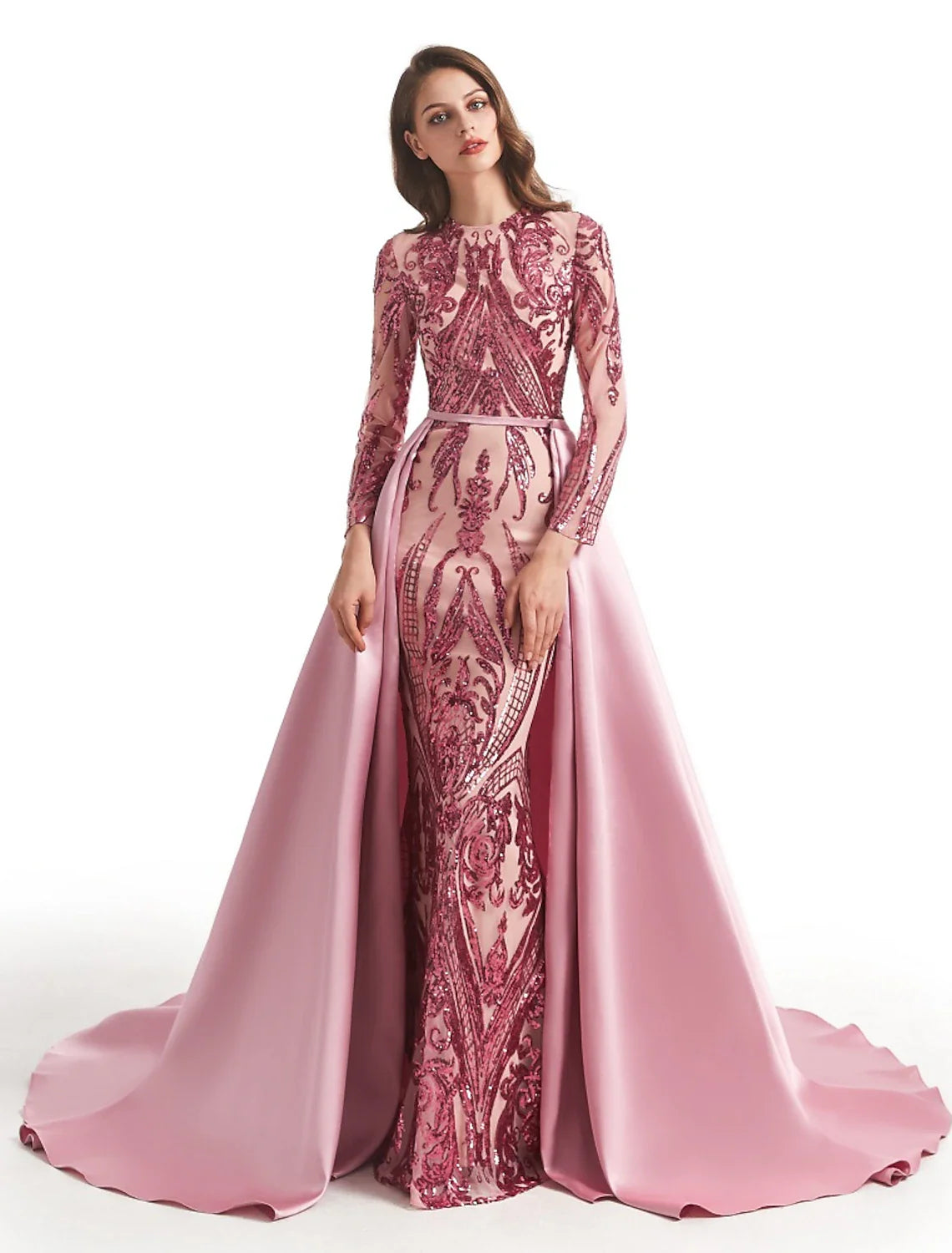 Mermaid Party Dress Evening Gown Luxurious Dress Carnival Wedding Guest Court Train Long Sleeve Jewel Neck Detachable Satin with Sequin Overskirt Pattern / Print
