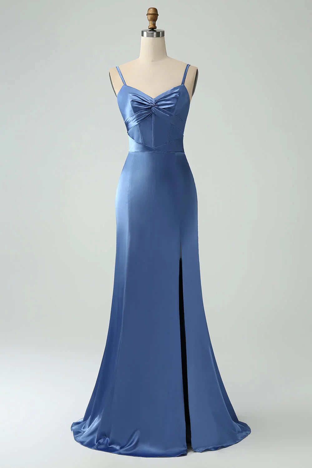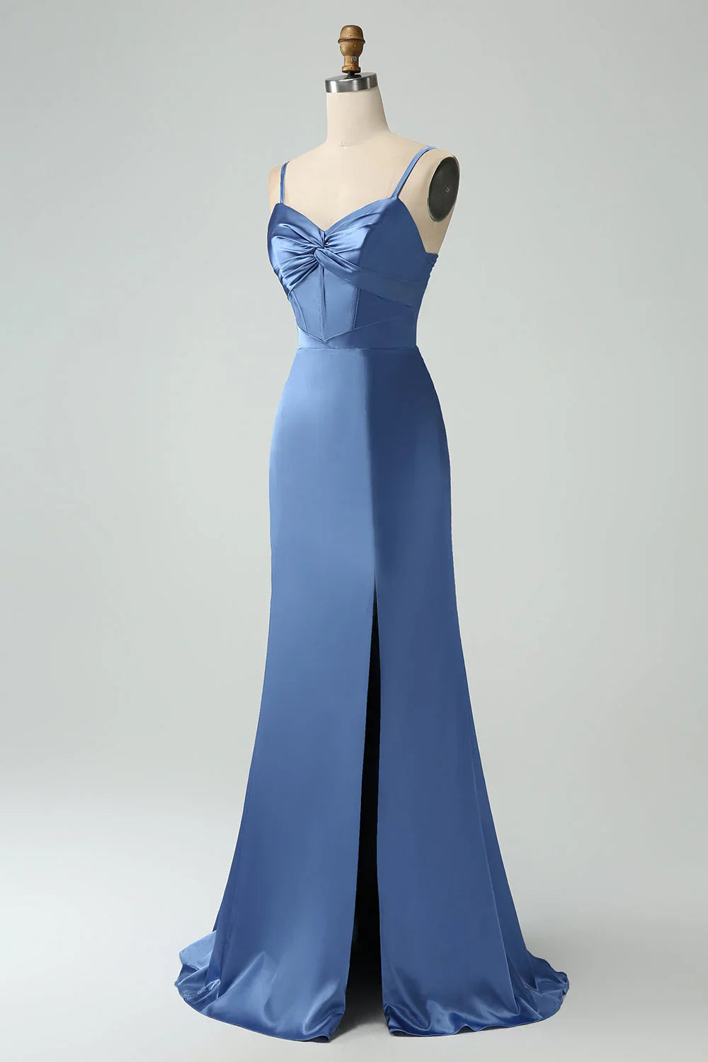 Mermaid Spaghetti Straps Long Satin Bridesmaid Dress With Slit