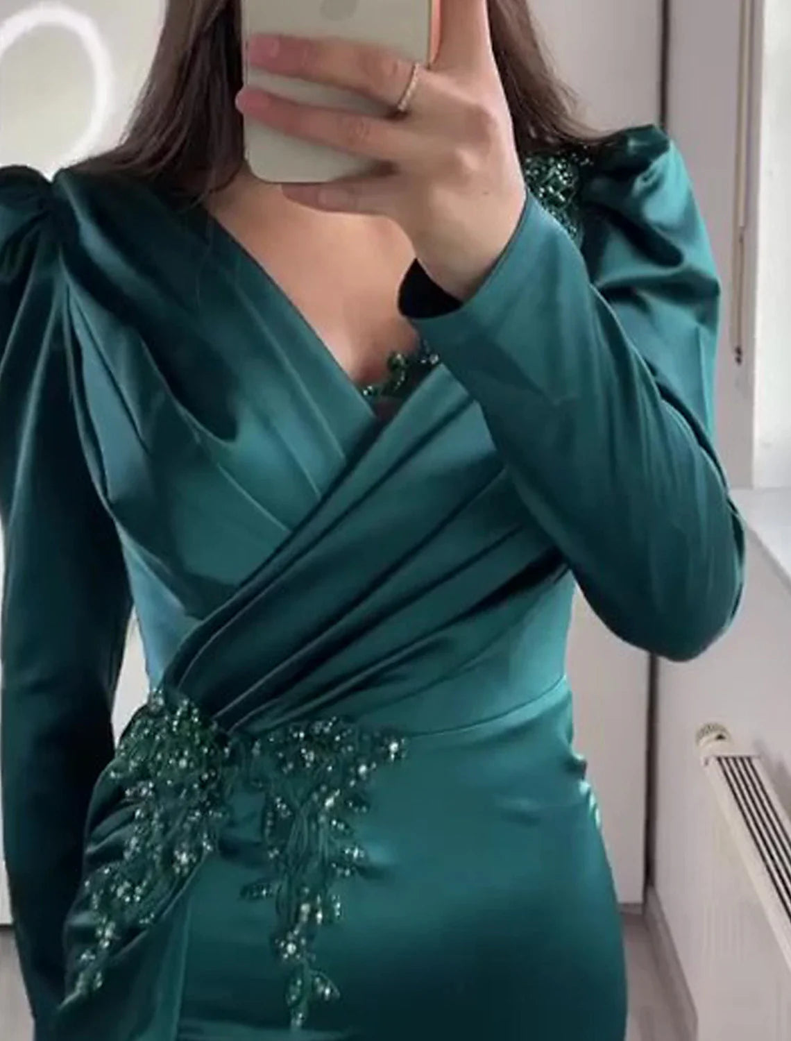 Mermaid / Trumpet Evening Gown Elegant Dress Formal Wedding Guest Floor Length Short Sleeve V Neck African American Satin with Ruched Appliques