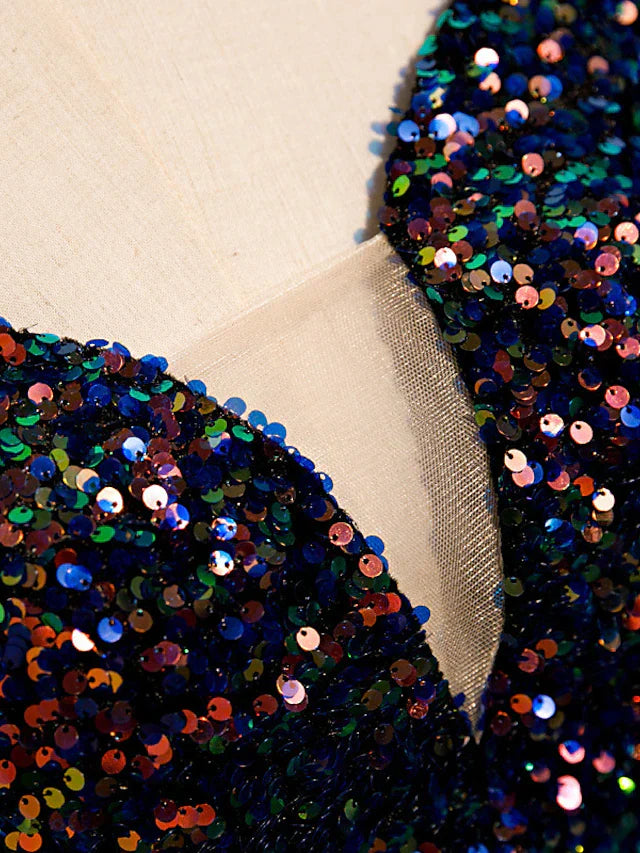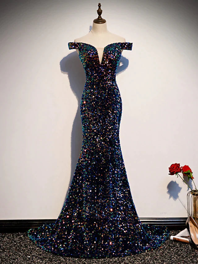 Mermaid / Trumpet Mother of the Bride Dress Wedding Guest Elegant Sparkle & Shine Off Shoulder Sweep / Brush Train Sequined Cap Sleeve with Solid Color