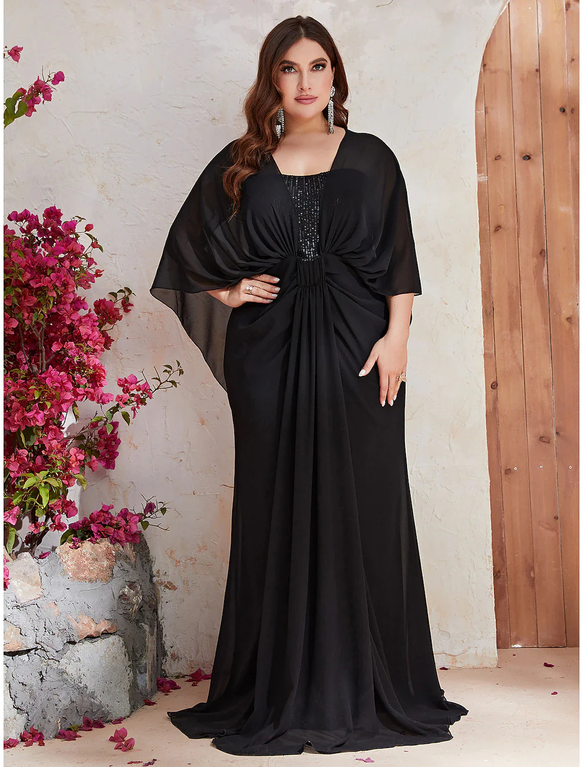 Mermaid / Trumpet Wedding Guest Dresses Plus Size Dress Formal Evening Party Dress Sweep / Brush Train Long Sleeve V Neck Polyester with Sequin Shawl