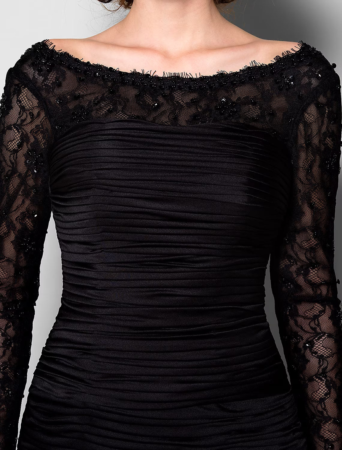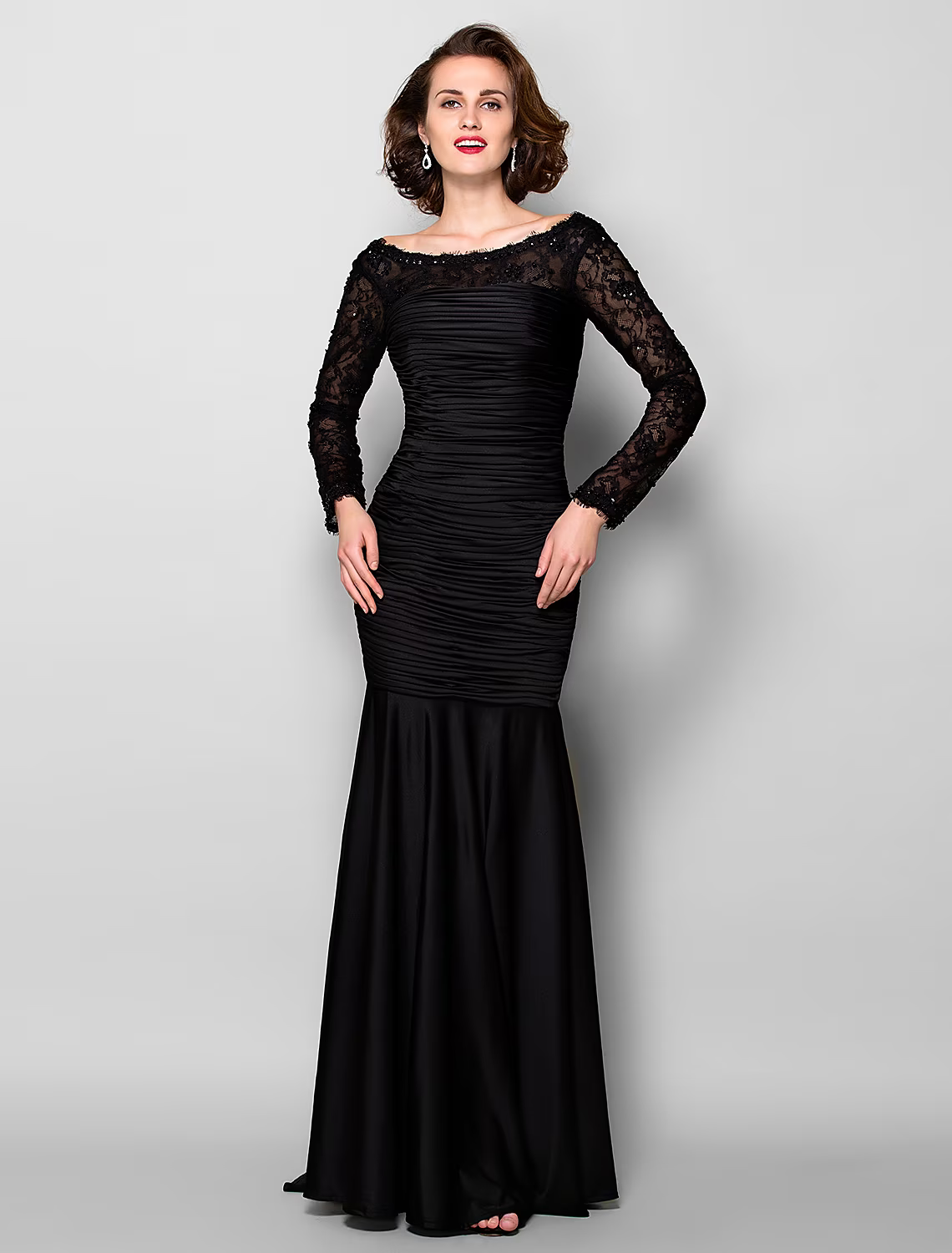 Mother of the Bride Dress Beautiful Back Lace Jersey Long Sleeve with Lace Ruched Beading