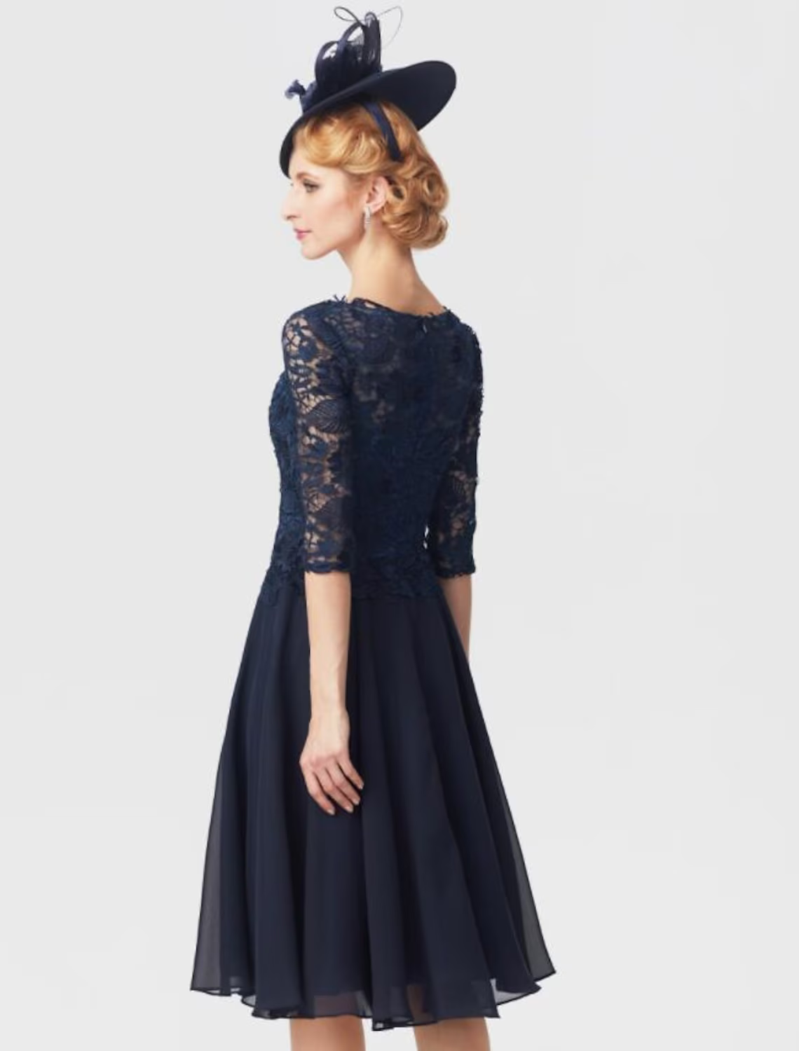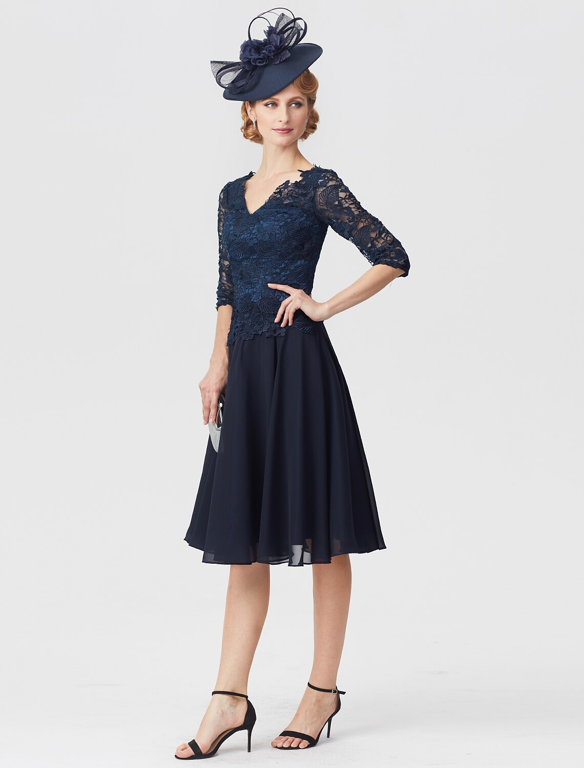 Mother of the Bride Dress Elegant V Neck Knee Length Chiffon Sheer Lace Half Sleeve with Lace