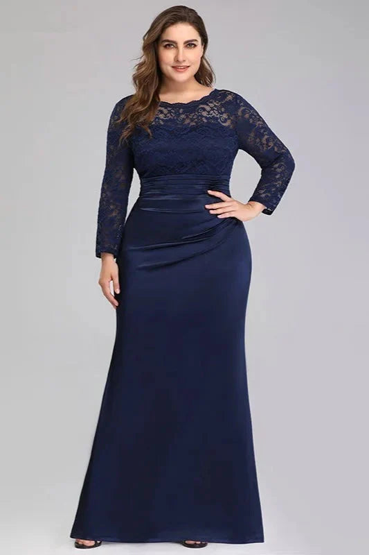 Navy Blue Long Sleeve Lace Mermaid Plus Size Evening Prom Dress