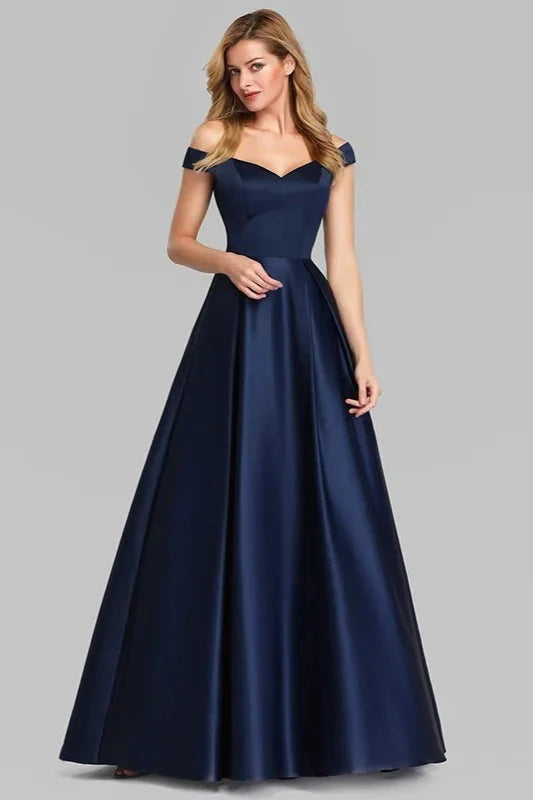 Navy Blue Satin Off-the-Shoulder Long Evening Gowns