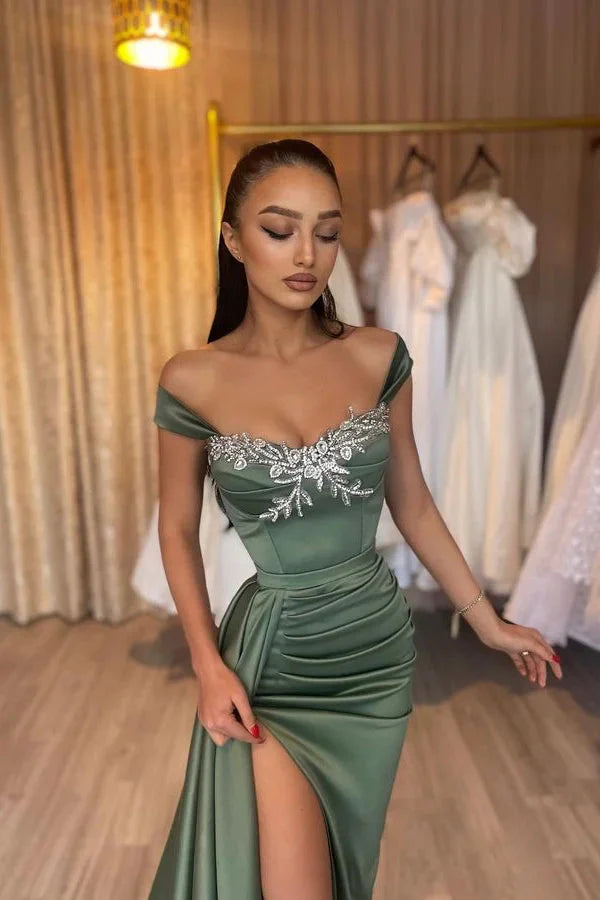 New Arrival Olive Green Straps Mermaid Evening Dress Pleats Ruffles With High Slit
